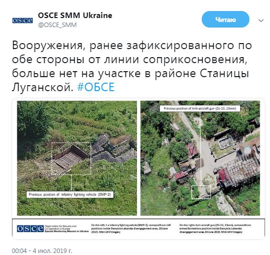 Наблюдательная мониторинговая миссия ОБСЕ утверждает, что в районе Станицы Луганской после разведения сил больше нет вооружений по обе стороны линии соприкосновения. Об этом говорится в Twitter миссии.