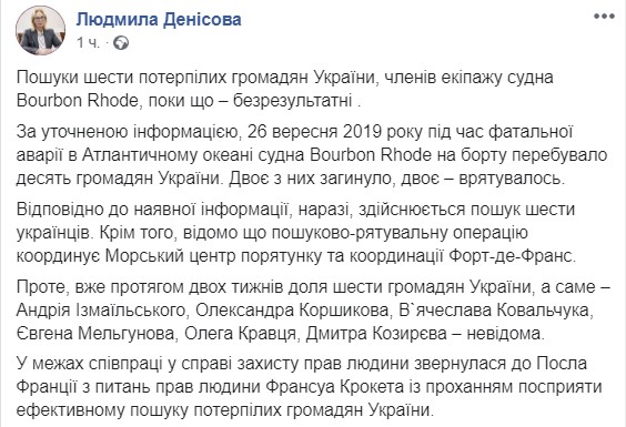Поиски шести украинских моряков, членов экипажа судна Bourbon Rhode, пока безрезультатны. Об этом сообщила уполномоченная Верховной рады по правам человека Людмила Денисова на своей странице в Facebook в пятницу.