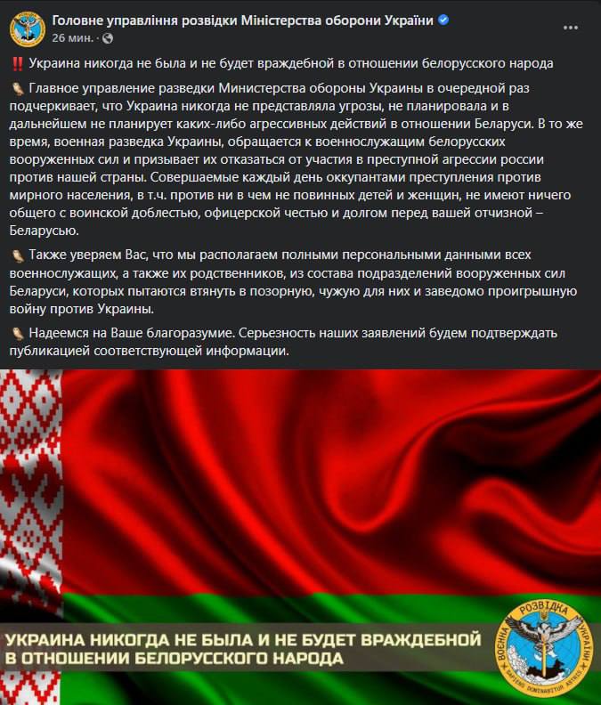 Главное управление разведки Минобороны Украины заявляет, что располагает полными персональными данными всех военнослужащих, а также их родственников, из состава подразделений вооруженных сил Беларуси, "которых пытаются втянуть в позорную, чужую для них и заведомо проигрышную войну против Украины".