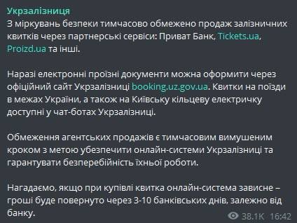 "Ограничение агентских продаж является временным вынужденным шагом с целью обезопасить онлайн-системы "Укрзализныци" и гарантировать бесперебойность их работы", - говорится в сообщении.