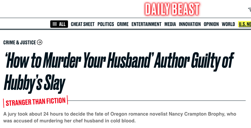 В США писательницу и автора эссе "Как убить мужа" Нэнси Крэмптон-Брофи признали виновной в убийстве мужа. Преступление она совершила в 2017 году, а эссе написала за 6 лет до этого.
