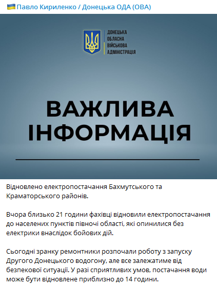 Электроснабжение Бахмутского и Краматорского районов Донецкой области восстановлено. Также там сегодня могут дать воду.