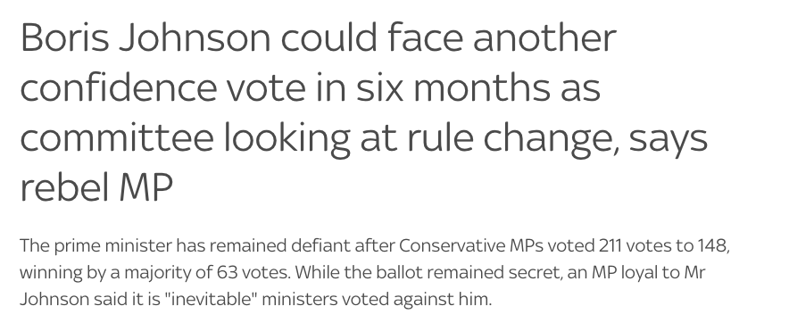 Депутат-консерватор Тобиас Элвуд заявил, что в таком случае, следующее голосование по вотуму доверия Джонсону может состояться уже через шесть месяцев.