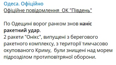 Утром во вторник россияне нанесли ракетный удар по Одесской области