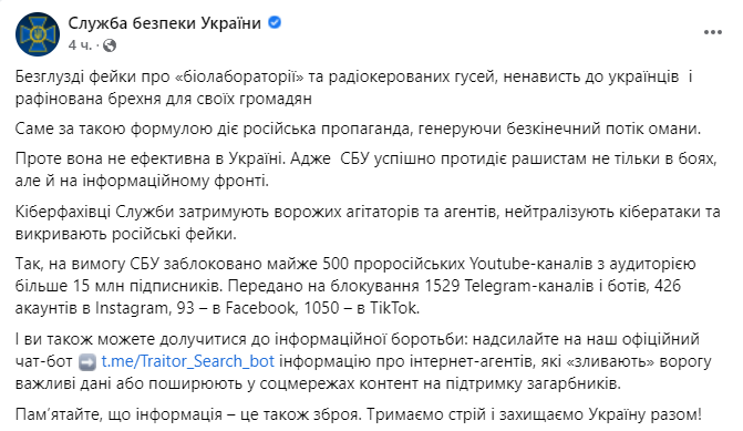 "Передано на блокирование 1529 Telegram-каналов и ботов, 426 аккаунтов в Instagram, 93 – в Facebook, 1050 – в TikTok", - сообщает пресс-служба СБУ.