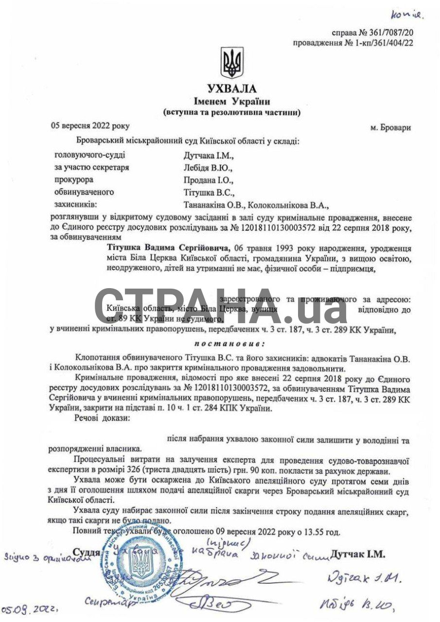 Вадиму Титушко инкриминировали разбойные нападения и незаконное завладение транспортным средством. Досудебное расследование длилось с 2018 года, в суд дело было направлено в 2020 году. А в 2022-м году дело против Титушко закрыли.