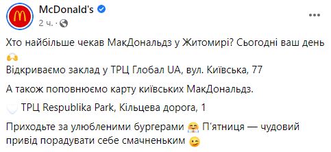 "Кто больше всего ждал МакДональдз в Житомире? Открываем заведение в ТРЦ Глобал UA, ул. Киевская, 77".