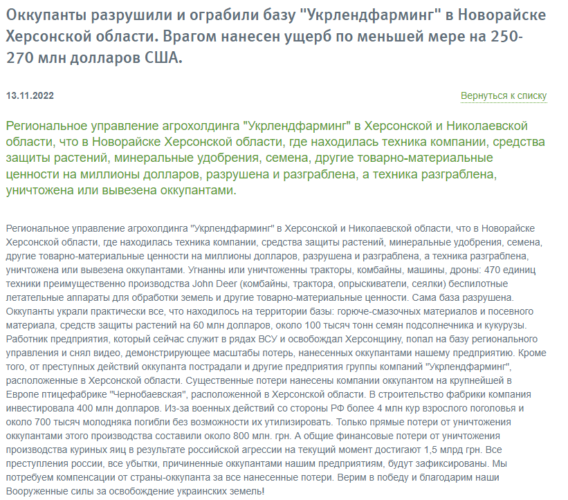 "Региональное управление агрохолдинга "Укрлендфарминг" в Херсонской и Николаевской области, что в Новорайске Херсонской области, где находилась техника компании, средства защиты растений, минеральные удобрения, семена, другие товарно-материальные ценности на миллионы долларов, разрушена и разграблена, а техника разграблена, уничтожена или вывезена оккупантами.