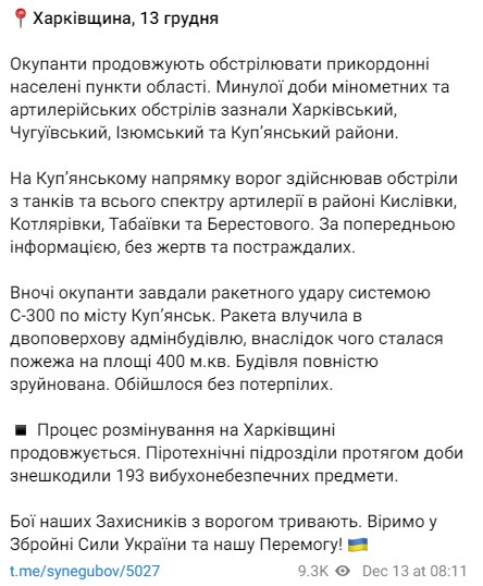 Ночью враг нанес ракетный удар системой С-300 по Купянску. Ракета попала в двухэтажное админздание, в результате чего возник пожар на площади 400 м.кв. Здание полностью разрушено.