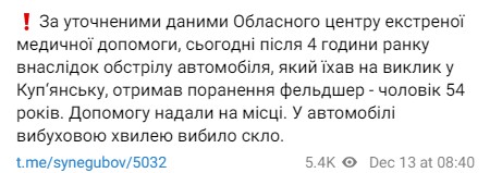 По данным Областного центра экстренной медицинской помощи, сегодня утром был обстрелян автомобиль в Купянске. Фельдшер ехал на вызов. Однако авто подверглось обстрелу, мужчина 54 лет пострадал. В автомобиле взрывной волной выбило стекло.