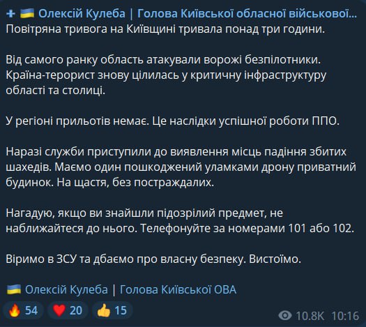 7:43 Губернатор Кулеба подтвердил атаку "Шахидов" на Киевскую область и заявил, что большинство из них сбито.