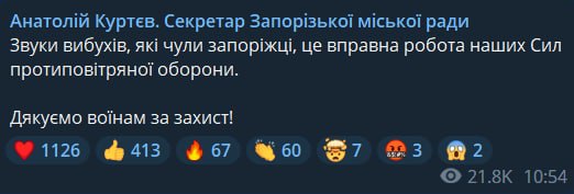11.10 Звуки взрывов, которые слышали в Запорожье - результат работы ПВО, сообщил секретарь горсовета Запорожья Анатолий Куртев.
