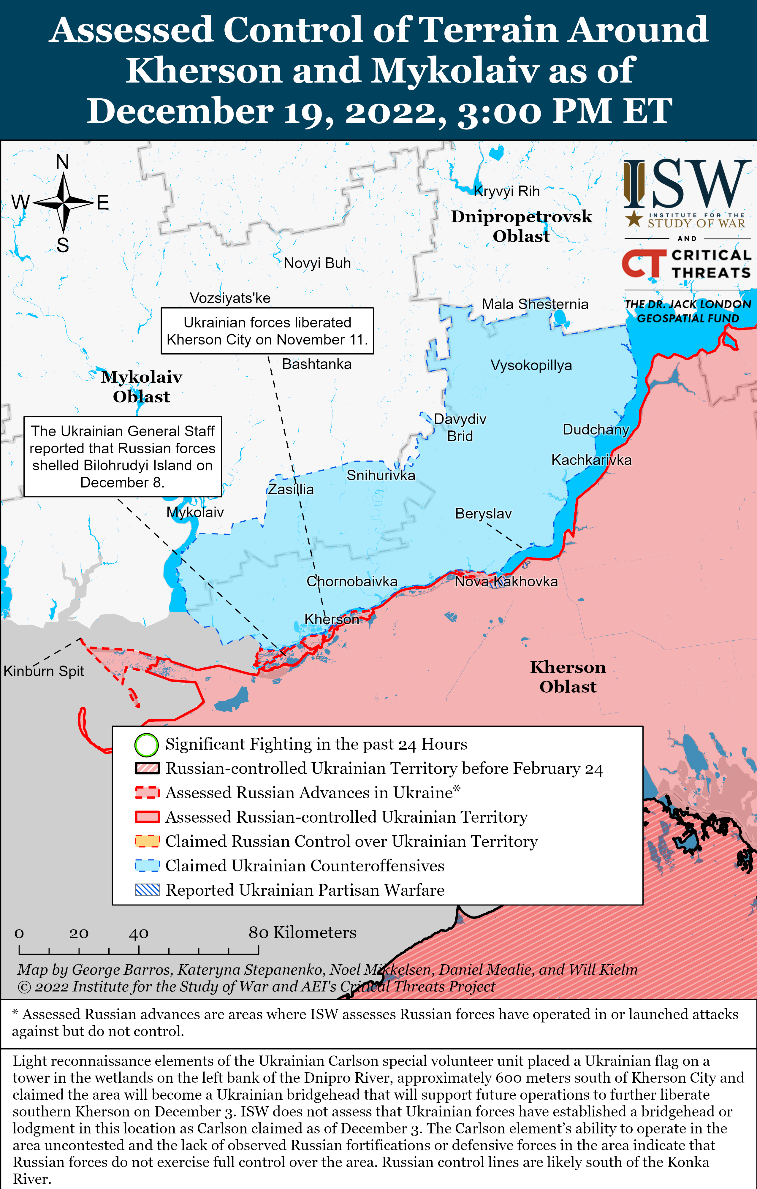 Украинские официальные лица сообщили, что российские силы отводят некоторые подразделения из районов вдоль восточного (левого) берега реки Днепр в Херсонской области. Начальник Объединенного украинского пресс-центра Сил обороны Таврического направления Евгений Ери заявил 19 декабря, что российские войска продолжают строить оборону на востоке Херсонской области и пытаются отвести свои основные части из зоны досягаемости артиллерии ВСУ.