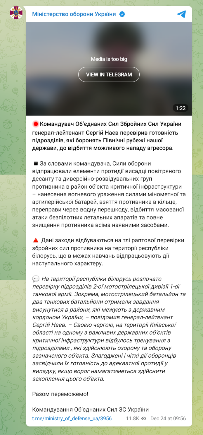 В Беларуси один мотострелковый батальон и один танковый получили задание выдвинуться в районы, которые граничат с государственной границей Украины. ВСУ готовятся к возможному вторжению противника.