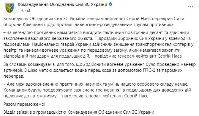 "По легенде противник пытается высадить тактический воздушный десант и осуществить захват важного государственного объекта. Подразделения ВСУ во взаимодействии с подразделениями Нацгвардии осуществили уничтожение транспортных вертолетов в воздухе и нанесли огневое поражение по передовому отряду, пытавшемуся захватить соответствующий плацдарм для дальнейших действий, – комментирует Наев.