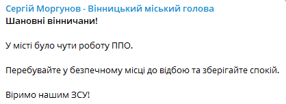 "Уважаемые винничане! В городе было слышно работу ПВО. Находитесь в безопасном месте до отбоя и сохраняйте спокойствие. Верим нашим ВСУ!", - сообщает городской голова Винницы Сергей Моргунов в своем телеграм-канале.