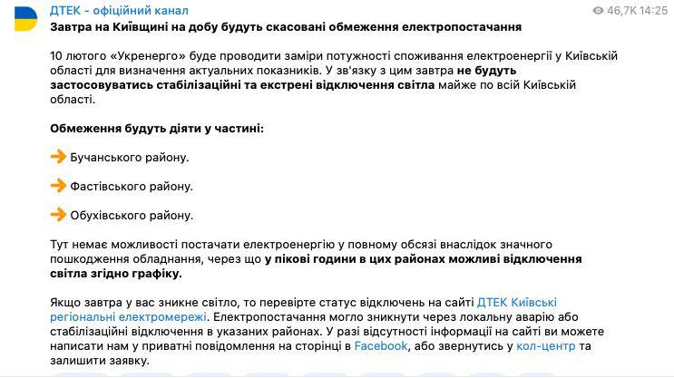 Ограничения все же будут частично действовать в Бучанском, Фастовском и Обуховском районах, поскольку туда сейчас невозможно поставлять электроэнергию в полном объеме.
