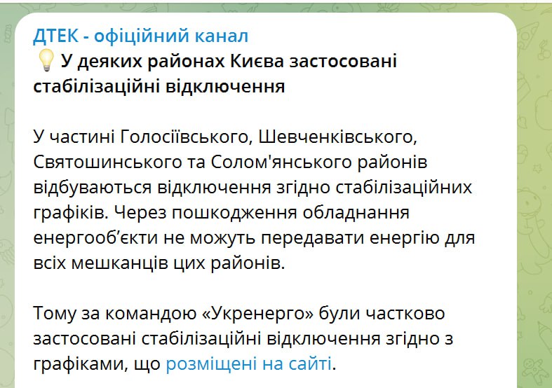 В Киеве начали отключать свет в части Голосеевского, Шевченковского, Святошинского и Соломенского районов. Стабилизационные отключения вводятся из-за поврежденного в результате ракетного обстрела оборудования.