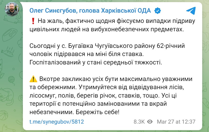 В Харьковской области у пруда на мине подорвался 62-летний мужчина. Его госпитализировали