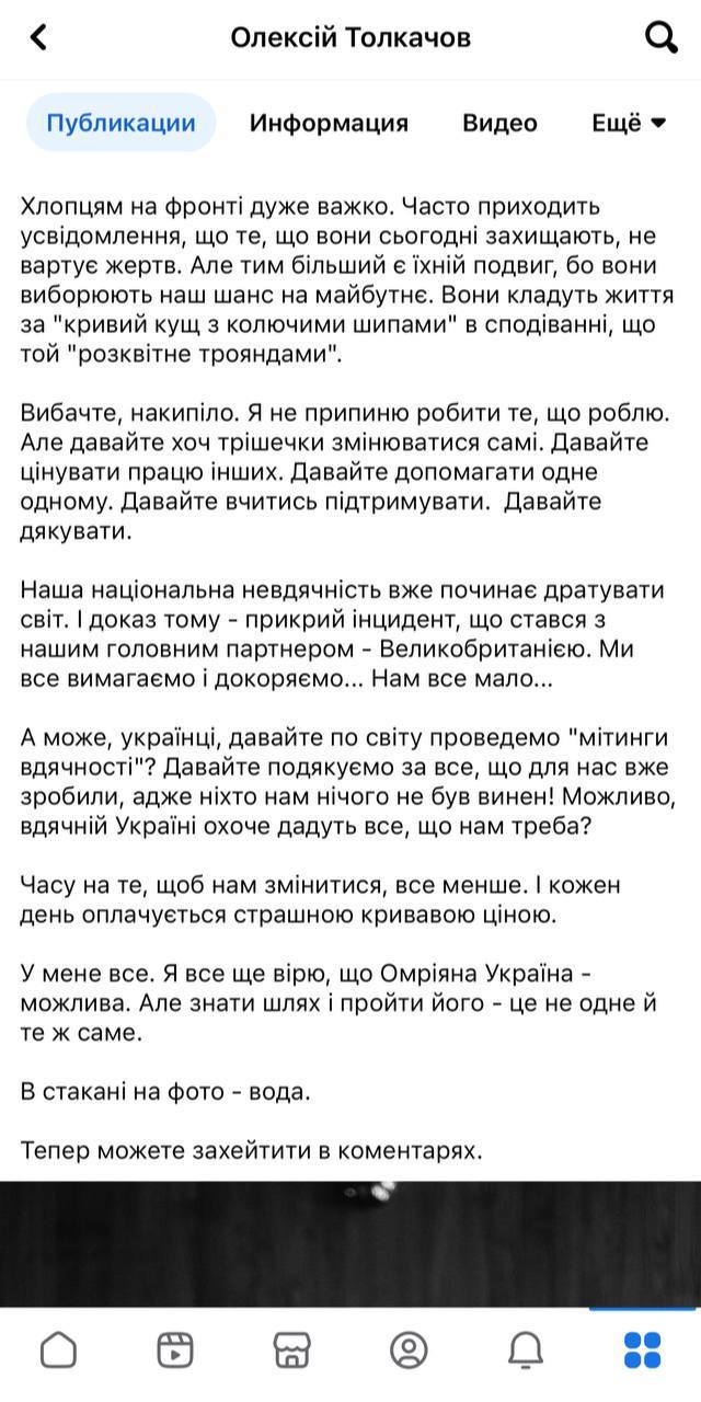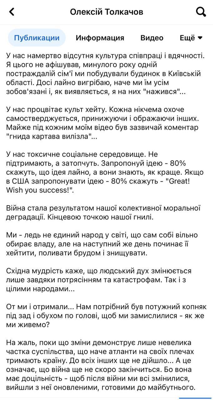 В сети бурно обсуждают пост общественного деятеля Алексея Толкачева, который заявил, что "украинцы заслужили войну".