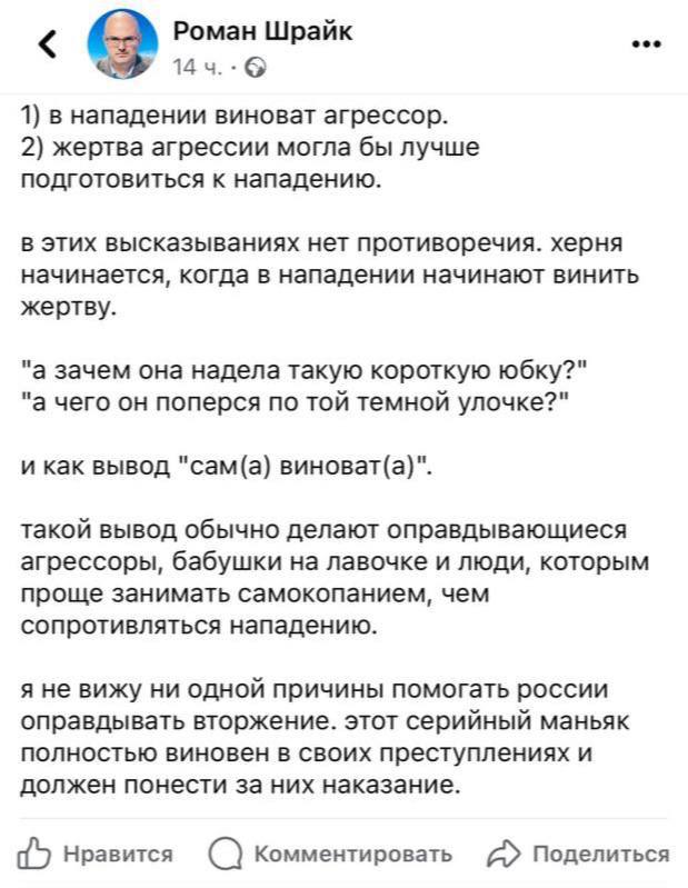 "А зачем она надела такую короткую юбку?" "а чего он поперся по той темной улочке?" и как вывод "сам(а) виноват(а)". Такой вывод обычно делают оправдывающиеся агрессоры, бабушки на лавочке и люди, которым проще заниматься самокопанием, чем сопротивляться нападению", — пишет Роман Шрайк.