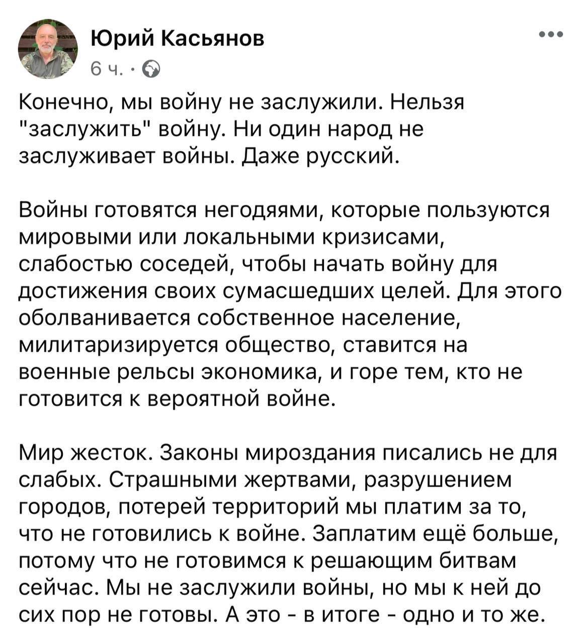 "Ни один народ не заслуживает войны. Даже русский. Войны готовятся негодяями, которые пользуются мировыми или локальными кризисами, слабостью соседей, чтобы начать войну для достижения своих сумасшедших целей", — написал у себя Facebook Юрий Касьянов.