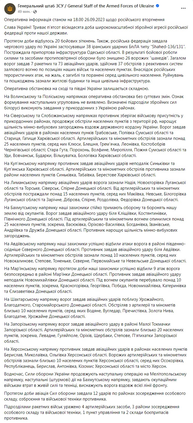 Генеральный штаб ВСУ опубликовал оперативную информацию о ситуации на фронте по состоянию на 18:00 26 сентября.