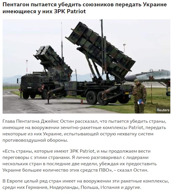 Глава Пентагона Ллойд Остин рассказал, что пытается убедить страны, имеющие на вооружении зенитно-ракетные комплексы Patriot, передать некоторые из них Украине, испытывающей острую нехватку систем противовоздушной обороны.