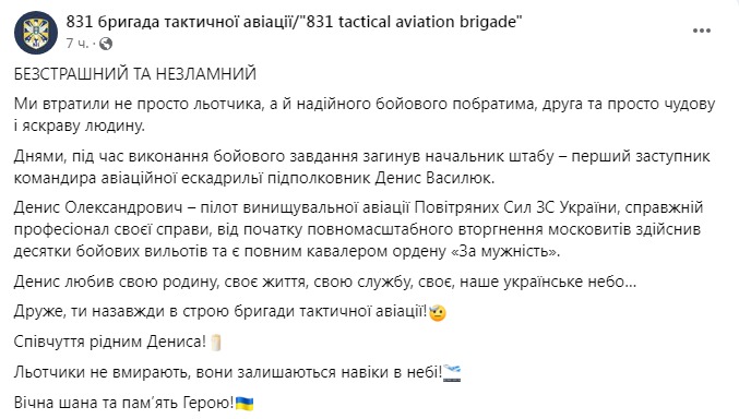 21.25 Во время выполнения боевго задания погиб начальник штаба и первый заместитель командира авиационной эскадрильи подполковник Денис Василюк, сообщается в Фейсбуке 831-й бригады тактической авиации.