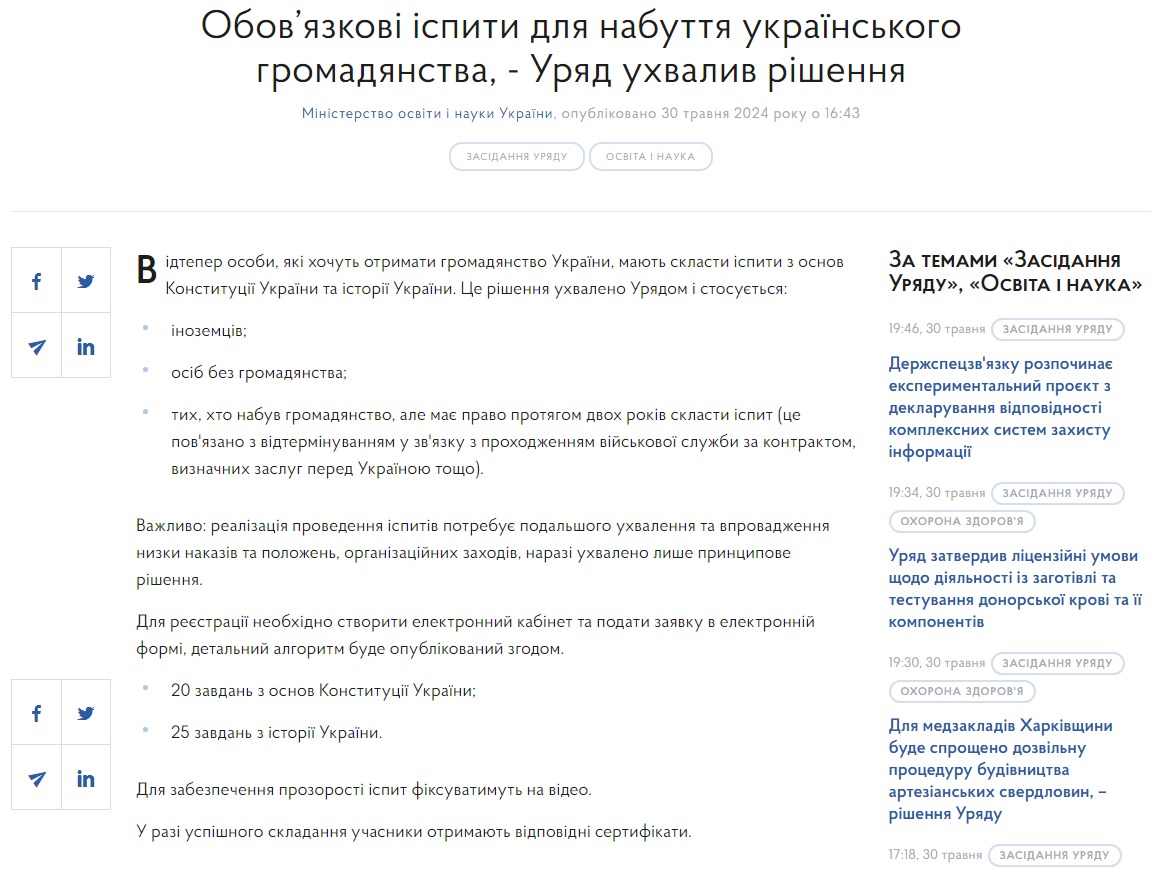 Кабинет министров принял решение об обязательных экзаменах для приобретения гражданства Украины.