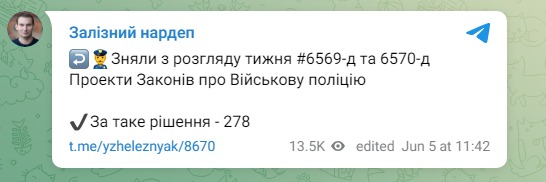 "Сняли с рассмотрения недели №6569-д и №6570-д - проекты законов о военной полиции. За такое решение – 278 (голосов)", - написал нардеп.
