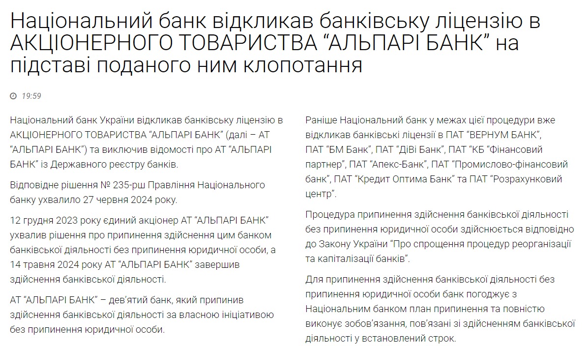 В Украине стало на один банк меньше: общая численность сократилась с 63 до 62 структур. 27 июня правление Нацбанка приняло решение №235-рш об отзыве лицензии у "Альпари Банка" и его исключении из государственного реестра.