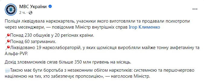 Для разоблачения сети торговли наркотиками было проведено более 230 обысков в 20 регионах страны. Более 60 человек задержали, также ликвидировано 19 нарколабораторий, в которых ежемесячно производили почти тонну амфетамина и синтетического психостимулятора класса катинонов альфа-PVP.