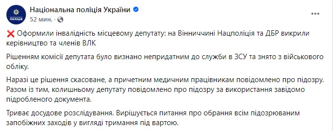 Судебно-медицинская экспертиза установила, что у мужчины нет цирроза печени. Поэтому центральная ВВК ВСУ отменила постановление о непригодности. За использование заведомо подложного документа бывшему депутату сообщили о подозрении по ч. 4 ст. 358 Уголовного кодекса Украины.