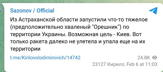 "Из Астраханской области запустили что-то тяжелое (предположительно, хваленый "Орешник") по территории Украины. Возможная цель – Киев. Вот только ракета далеко не улетела и упала еще на их территории", – написал Сазонов.