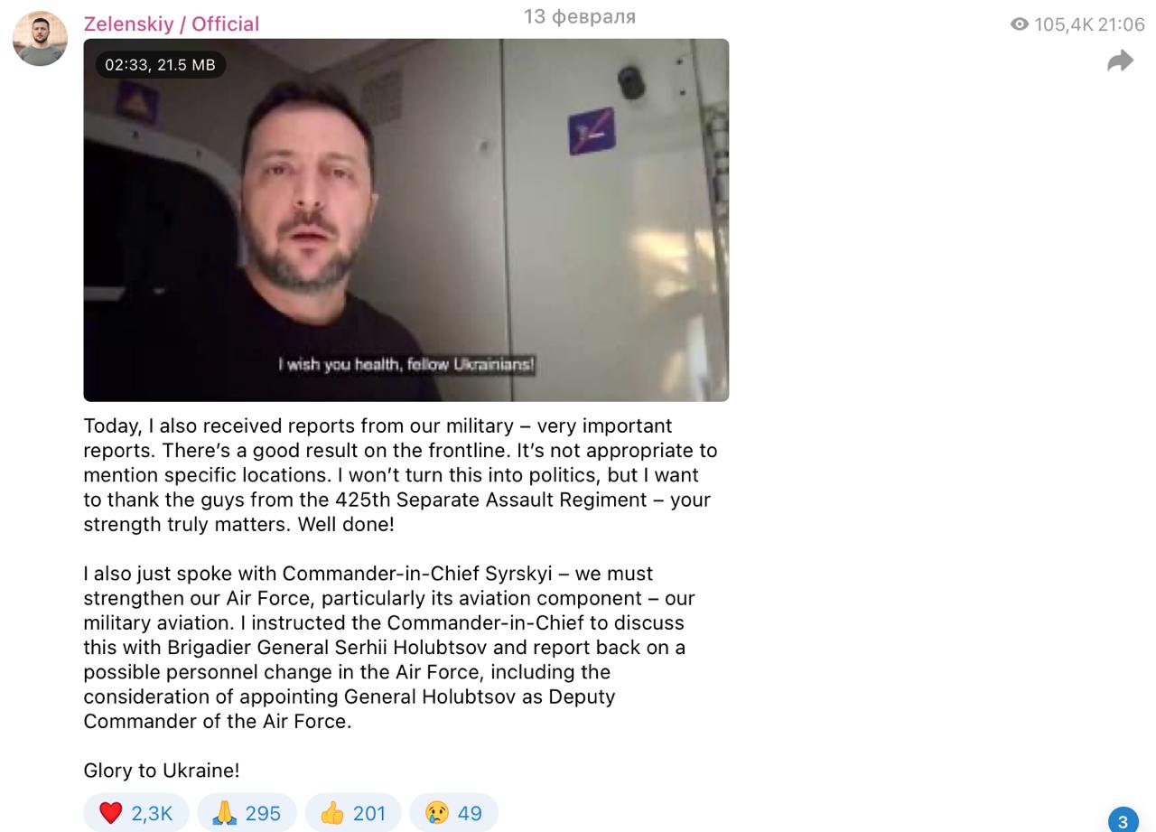 Тогда он в вагоне поезда произнес речь, посвященную докладам военного руководства, ситуации на передовой и разговору с главнокомандующим ВСУ Александром Сырским возможных кадровых изменениях в Воздушных силах.