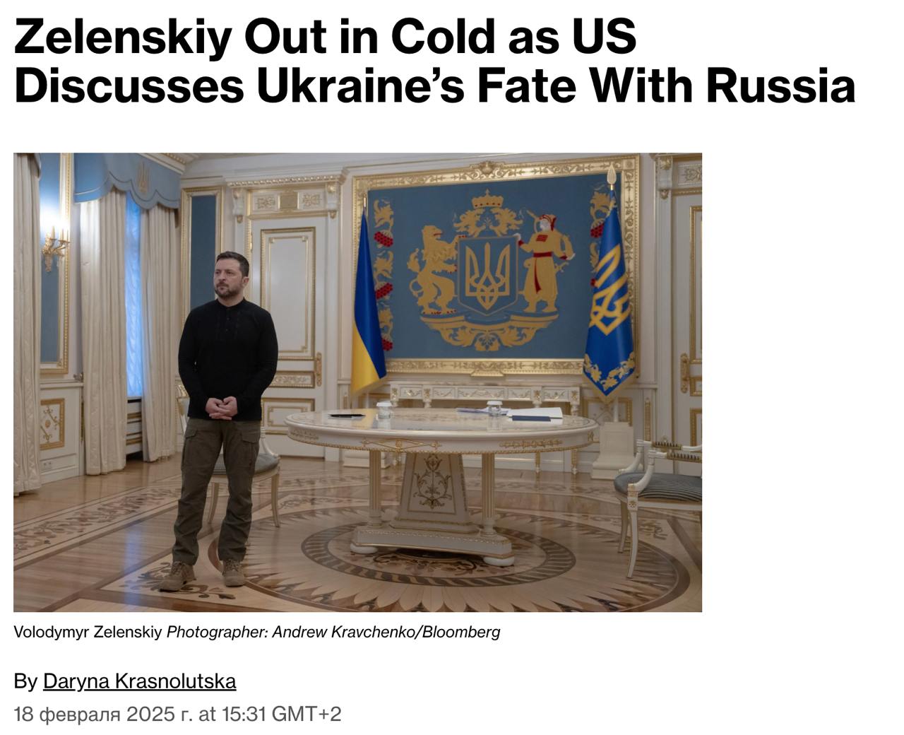 Комментируя сегодняшние переговоры в Эр-Рияде и информацию о том, что США и РФ были против приглашения на эту встречу представителей Украины, Bloomberg заявило, что Зеленского исключили из обсуждения судьбы Украины.