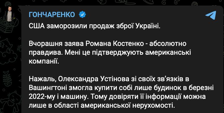 "США заморозили продажу оружия Украине. Вчерашнее заявление Романа Костенко – абсолютно правдивое. Мне это подтверждают американские компании", - сообщил Гончаренко.