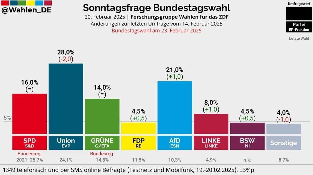 На втором месте - правая АдГ (21%), с которой глава блока ХДС/ХСС Мерц исключил возможность коалиции. У АдГ рейтинг подрос на 1%.