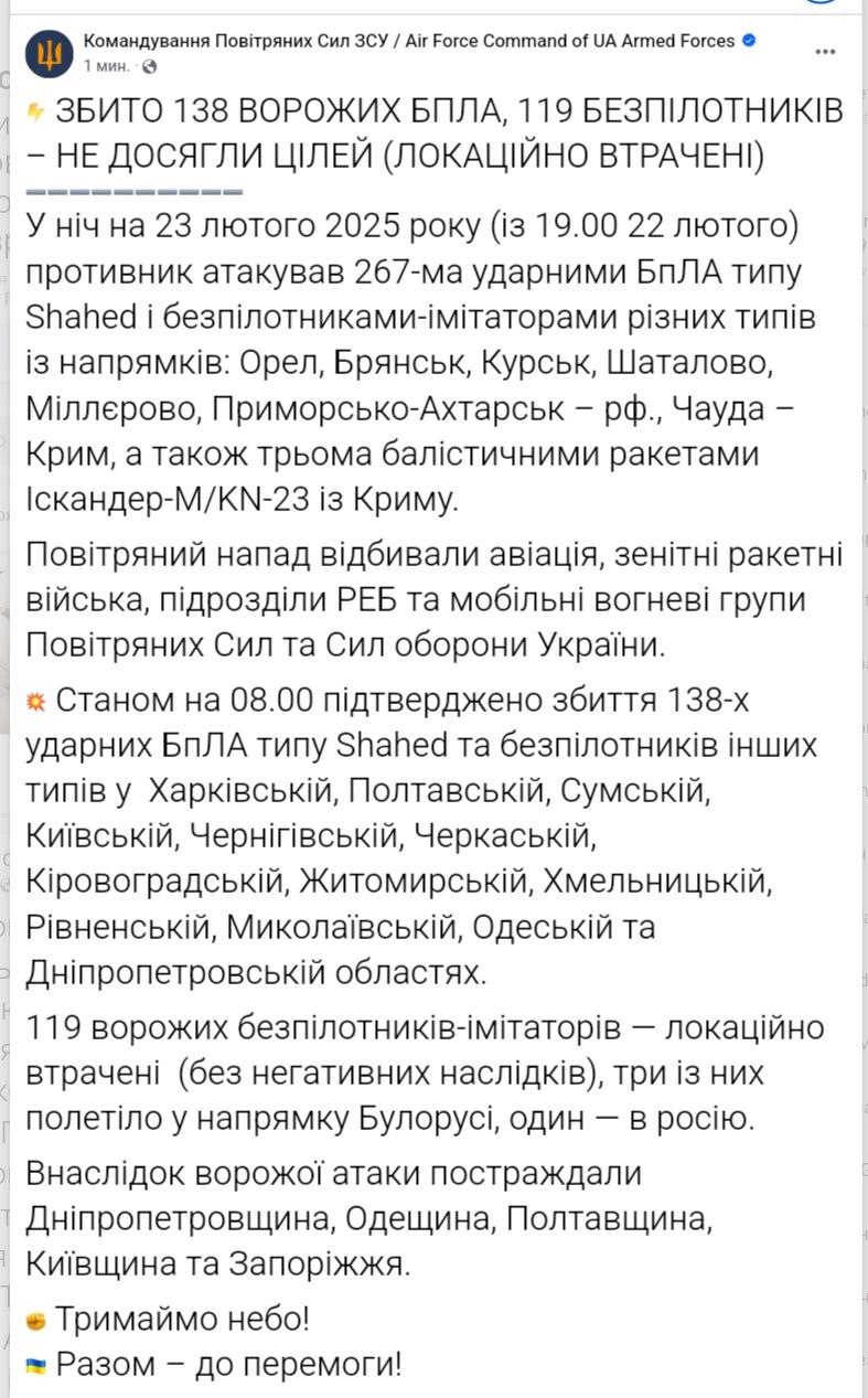 ВСУ сообщают, что 138 из них сбили, а 119 "локационно утрачены".