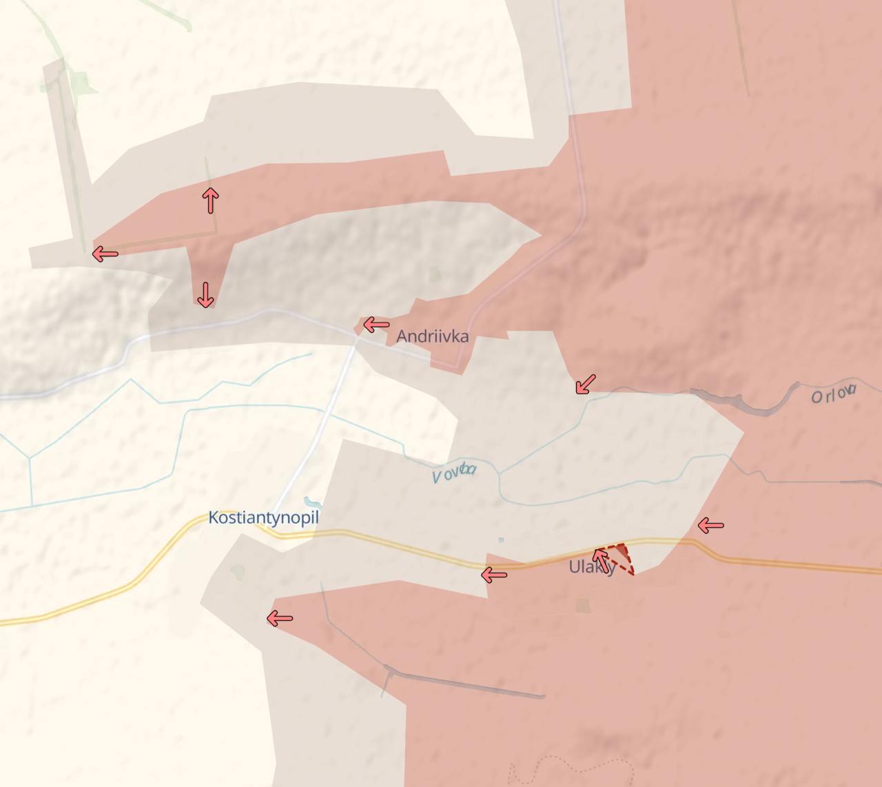 Военный обозреватель Мирошников указывает, что одновременно россияне продвигаются в районе села Разлив, чтобы обойти и зажать Константинополь с запада и оформить оперативное окружение.