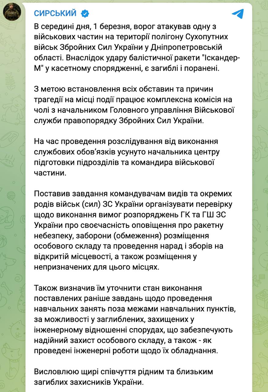 14.59 На время расследования ракетного удара по полигону в Новомосквоске, где погибли много военных, от выполнения служебных обязанностей отстранены начальник центра подготовки подразделений и командир воинской части.