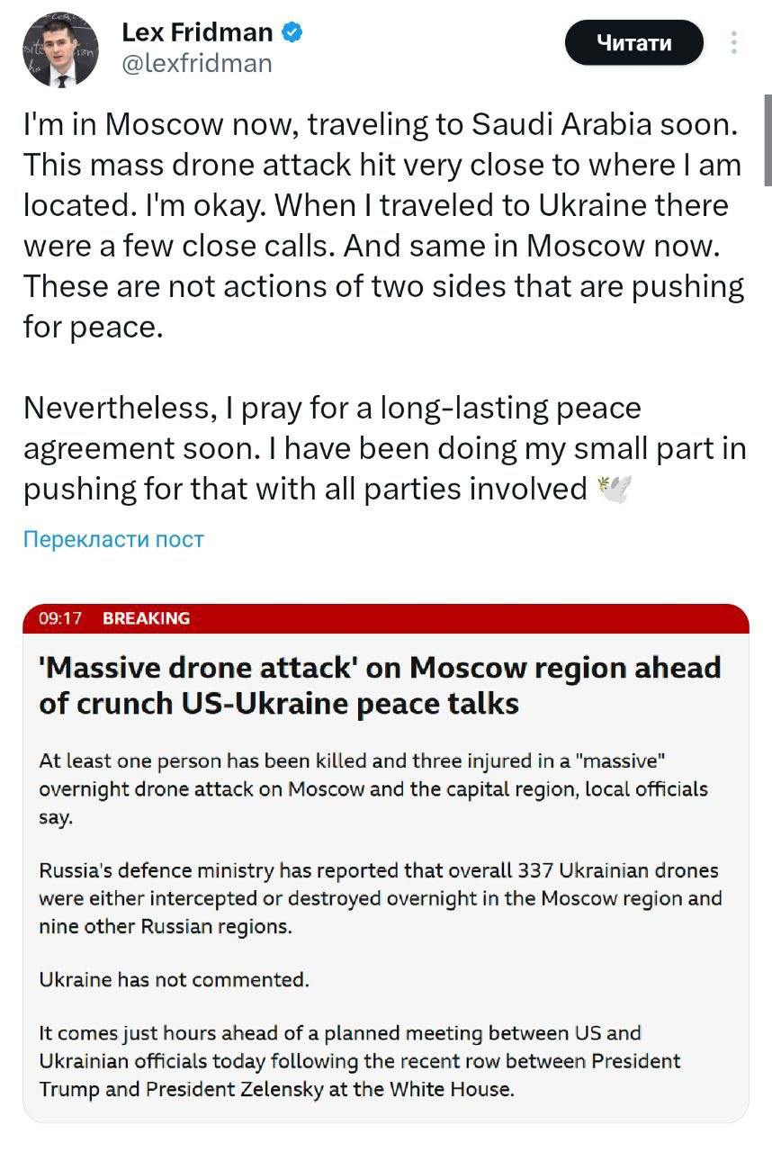 10.53 Американский подкастер Лекс Фридман рассказал, что находится в Москве и оказался рядом с местом ночной атаки дронов. По его словам, когда он был в Украине, то тоже оказался рядом с прилетами.