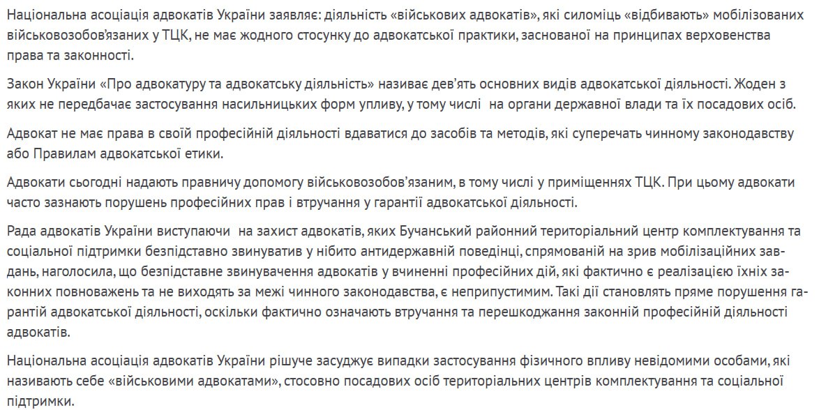 "Деятельность "военных адвокатов", насильно отбивающих мобилизованных военнообязанных в ТЦК, не имеет никакого отношения к адвокатской практике, основанной на принципах верховенства права и законности", - приводит сайт слова главы Национальной ассоциации адвокатов Украины Лидии Изовитовой.