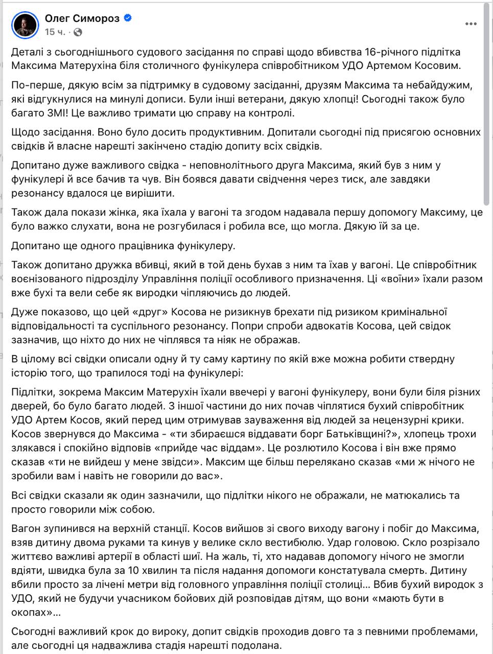 "Подростки ехали вечером в вагоне фуникулера. Из другой части к ним начал приставать бухой сотрудник УГО Артем Косов, который перед этим получал замечания от людей за нецензурные крики. Косов обратился к Максиму: "Ты собираешься отдавать долг Родине?" Парень немного испугался и спокойно ответил: "Придет время, отдам". Это разозлило Косова, и он уже прямо сказал: "Ты не выйдешь у меня отсюда". Максим еще более испуганно сказал: "Мы ведь ничего не сделали вам и даже не говорили с вами". Все свидетели сказали, как один отметили, что подростки никого не обижали, не матерились и просто говорили друг с другом. Вагон остановился на верхней станции. Косов вышел из вагона и побежал к Максиму, взял ребенка двумя руками и бросил в большое стекло вестибюля. Ушиб головой. Стекло разрезало жизненно важные артерии в области шеи", - написал Симороз.