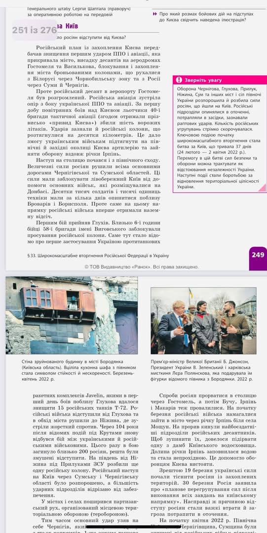 В целом на страницах нового учебника около 10 фотографий Зеленского с разных мероприятий и событий. Зеленский с экс-премьером Великобритании Борисом Джонсоном в Бородянке в 2022 году, Зеленский вручает награды военным, освободившим Херсон, Зеленский в Буче, Зеленский с президентом Еврокомиссии Урсулой фон дер Ляйен открывают табличку в честь европейского политика в Киеве, Зеленский передает украинский флаг Конгрессу США и прочее.