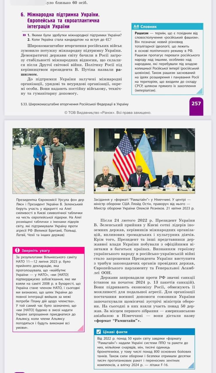 В конце этой главы (в ней описаны события до 2024 года) школьникам предлагают обсудить, что мешает Украине стать членом ЕС и НАТО.
