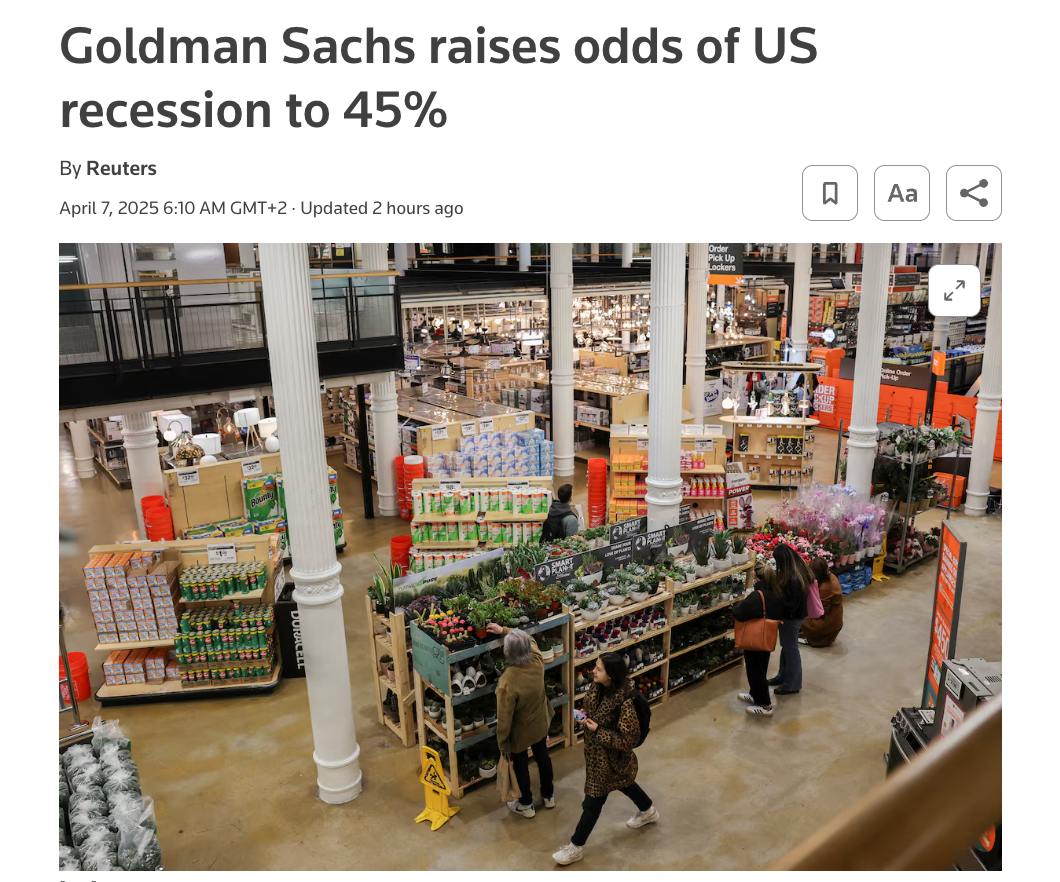 Как сообщает Reuters, банк Goldman Sachs повысил вероятность рецессии в США с 35% до 45%. А платформа биржевых прогнозов Polymarket оценивает вероятность рецессии в США в этом году на уровне 63%. Причем этот показатель резко пошел в рост с 3 апреля - после объявления Трампа о новых тарифах. Накануне риск оценивался в 40%.