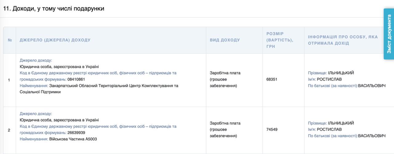 О работе 32-летнего Ильницкого в ТЦК стало известно из его декларации. В ней указано, что в 2024 году он получил денежное довольствие в двух структурах: воинской части А5003 (74,5 тысяч гривен) и Закарпатском областном ТЦК и СП (68 тысяч гривен).