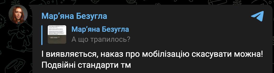 "Оказывается, приказ о мобилизации отменить можно! Двойные стандарты», - согласилась с этим нардеп Марьяна Безуглая.